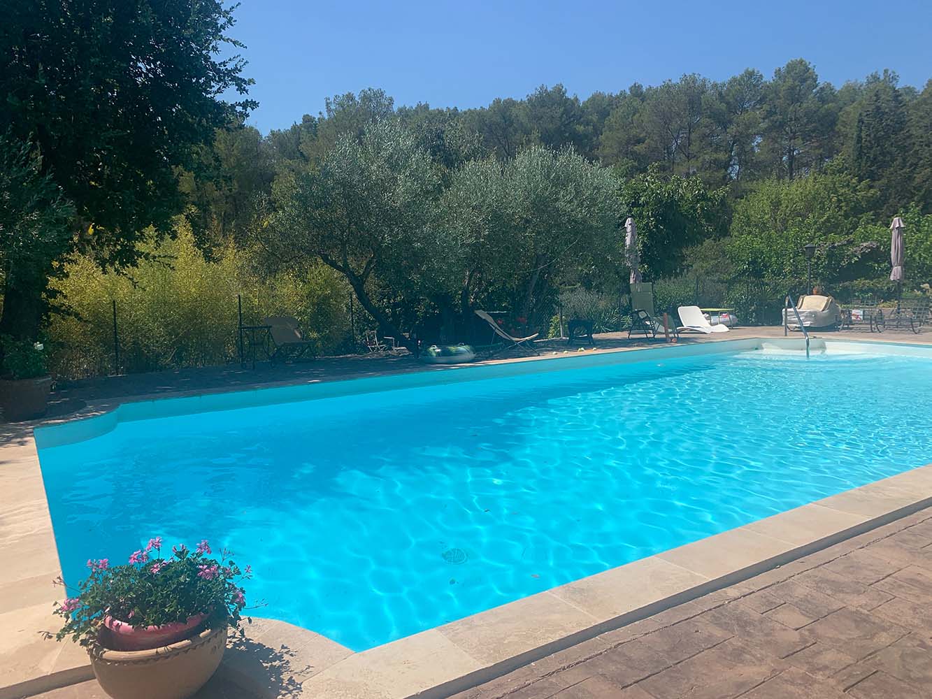 Puis quelques marches vous conduiront à la piscine d’une dimension de 12 m x 6 m sécurisée par une barrière en fer forgé.