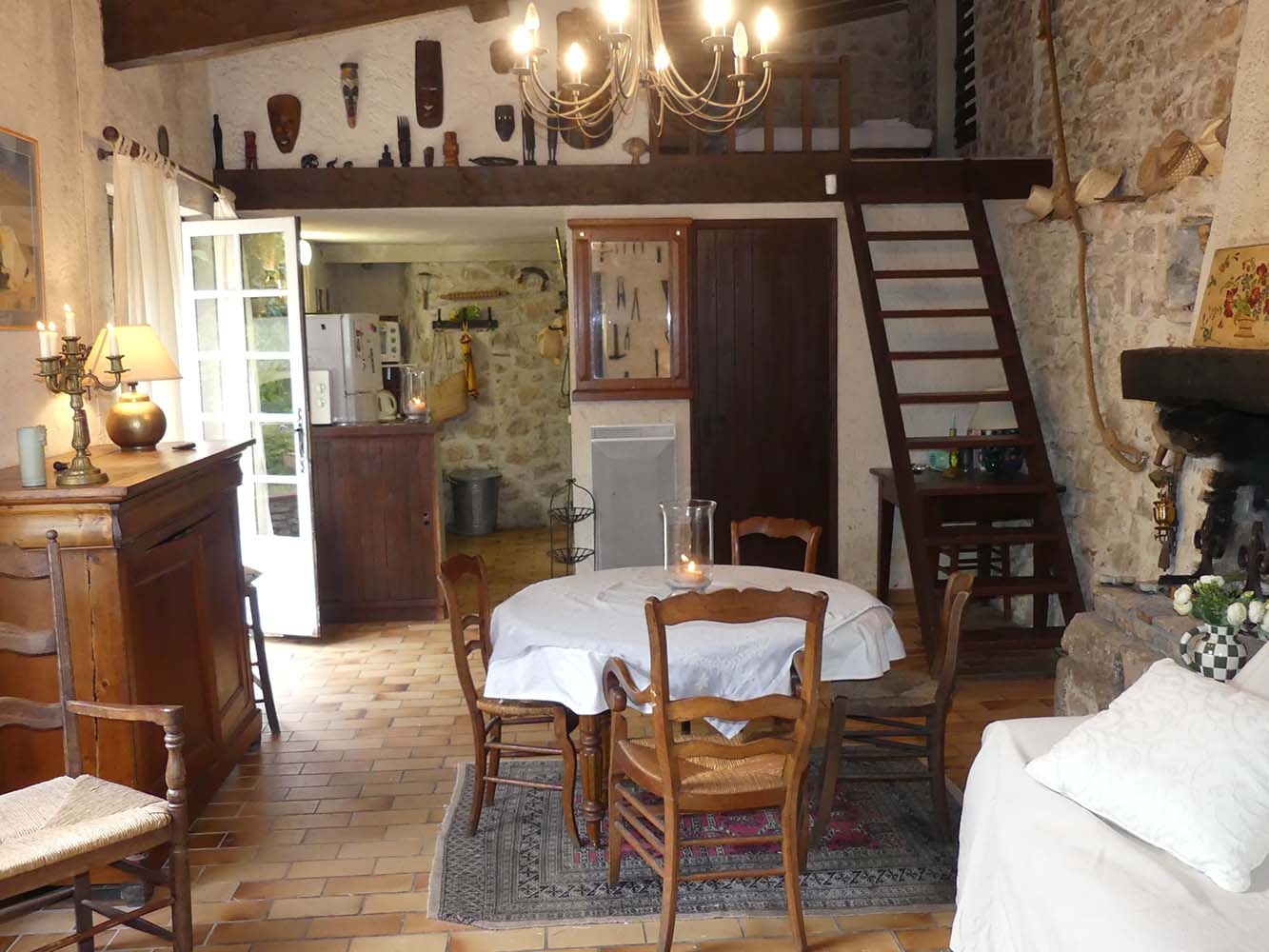 Une salle à manger avec coin cheminée, une cuisine équipée attenante avec une plaque de cuisson vitrocéramique, un lave vaisselle, un mini four, frigidaire congélateur, une salle de bain avec douche, une mezzanine avec un lit double et une grande chambre avec un lit double et un lit bateau (lit simple).